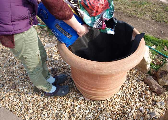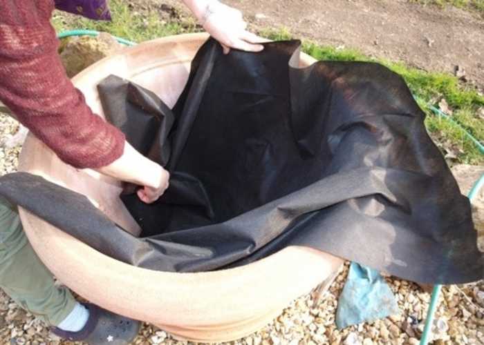 Now place permeable weed membrane on top of the crocks and up the sides of the pot to the rim.