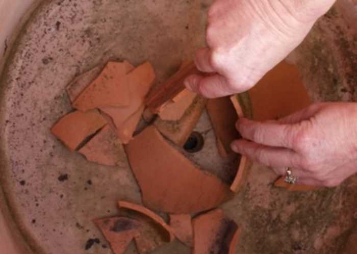 Now create a drainage layer. For this pot of medium size, we used crocks of broken pottery and some pea gravel. Avoid putting flat crocks directly over the drain hole. The pot we are planting is a Conca Classica 70cm x 57cm high, and we added crocks and gravel to a level of about 5cm (2 inches).
