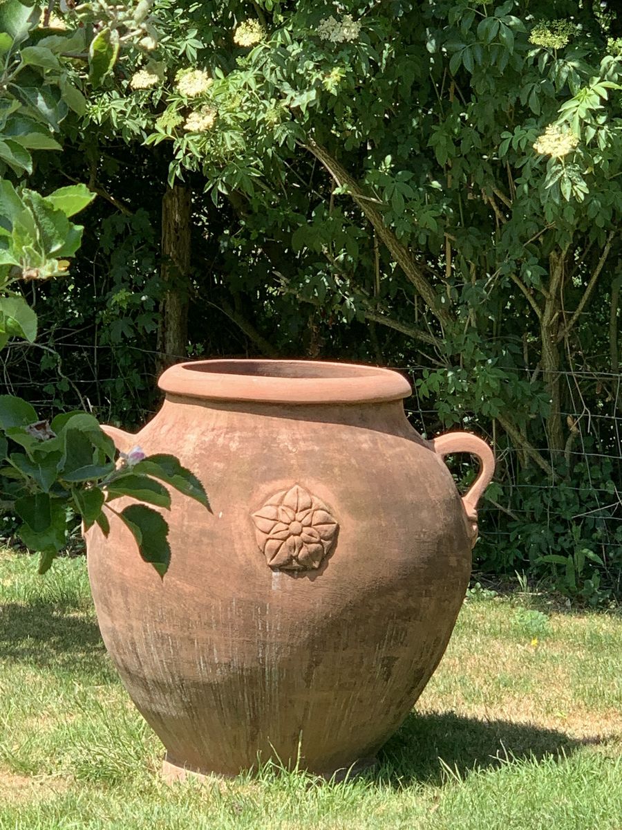 A large giara, standing at 1 metre high with an wide mouth, high handles, and a rossette boss. Both stock items have attractive weathering to them.
