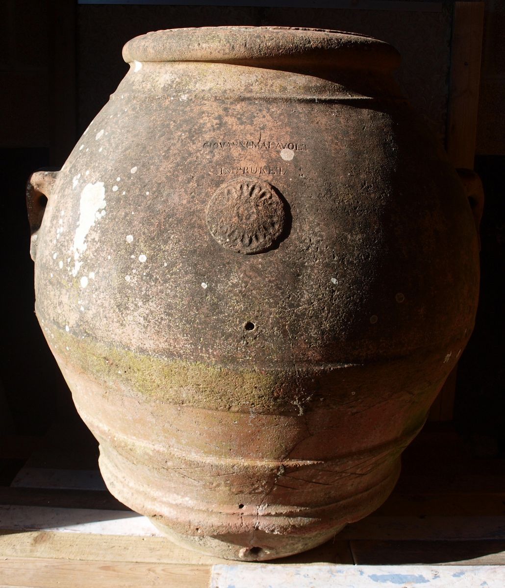 Stamped with the Kiln name: Giovanni Malavolti, Impruneta. This kiln operated during the late 1800s. This is a lovely Orcio with a full belly and handles placed mid-way. It has a rosy red patina and plenty of natural ageing. Standing at over one metre in height, this olive jar will make a huge statement piece.