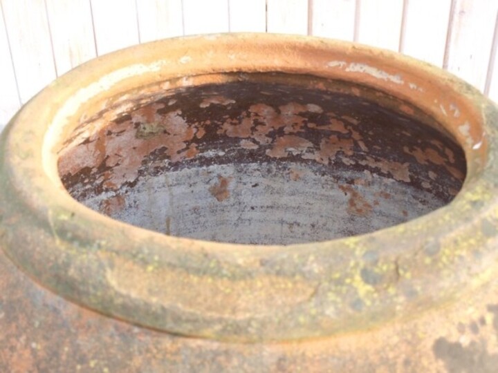 This antique orcio has a particularly wide opening, and the handles are placed high, giving it a more slender look to the more round-bellied olive jars. The interior has remains of a glaze, so most probably used as a vessel before being placed in the gardens as an ornament for all to enjoy.