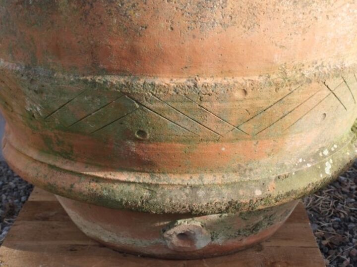 The mouth is wide compared to others in the collection, and the handles are placed high, giving it a more slender look to the more round-bellied olive jars. The interior has remains of a glaze, so most probably used as a vessel before being placed in the gardens as an ornament for all to enjoy. It is a lovely looking piece with moss growth and natural ageing, particularly around the floral boss and geometric decoration.